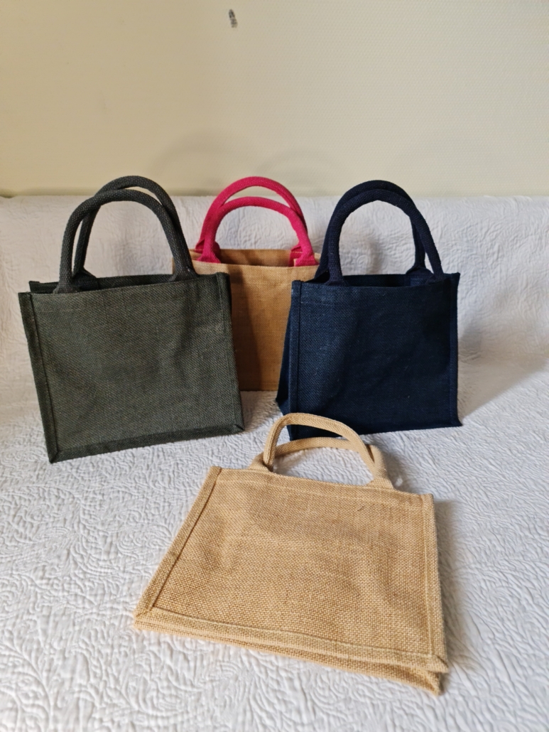 Die verschiedenen Taschenfarben (blau, natur, grau, natur mit Pinken Griffen) können gewählt werden,