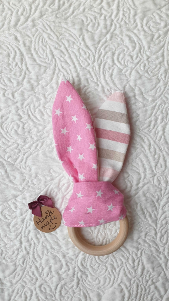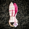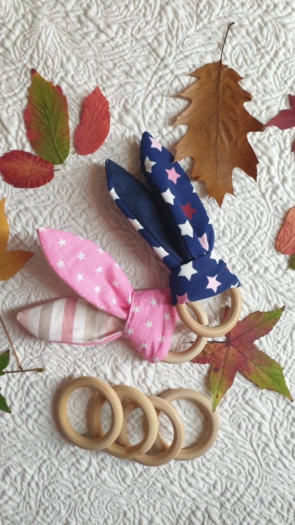 Der Ring und die Knisterohren regen zum Greifen und Spielen an. Der Hasenohr-Ring kann auch als Beißring verwendet werden.