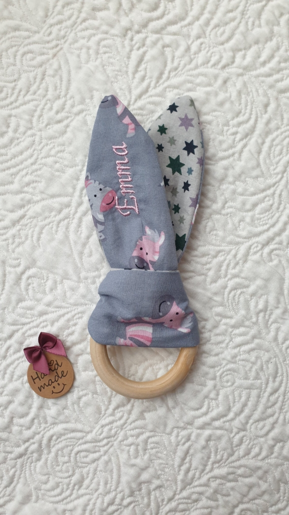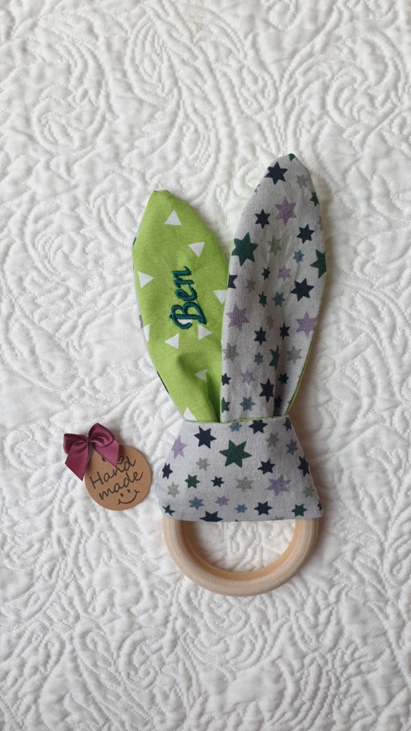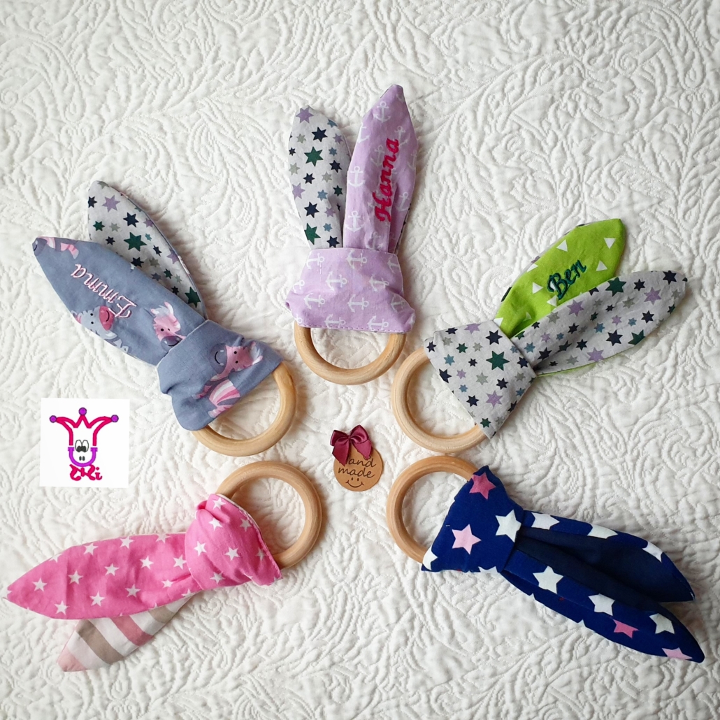 Die Knister-Ohren werden je nach Wunsch aus Jersey (95% Baumwolle 5% Elasthan z.B. passend z.B. zum Newbornset) oder aus 100% Baumwolle (alles Öko Tex Standard 100 zertifizierte Stoffe) handgenäht und auf Wunsch für einen Aufpreis von 4€ mit dem Wunschnamen bestickt.