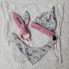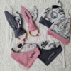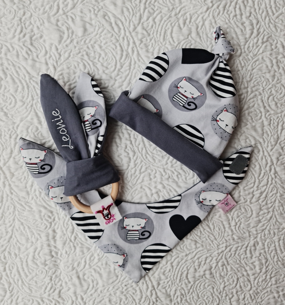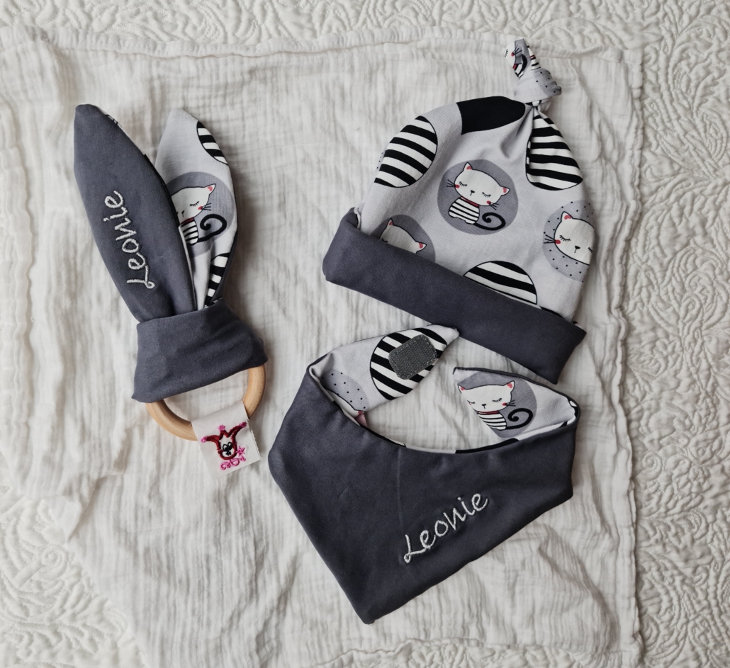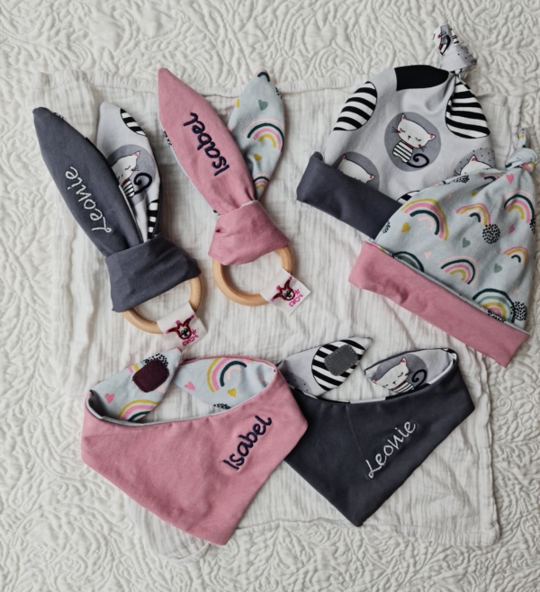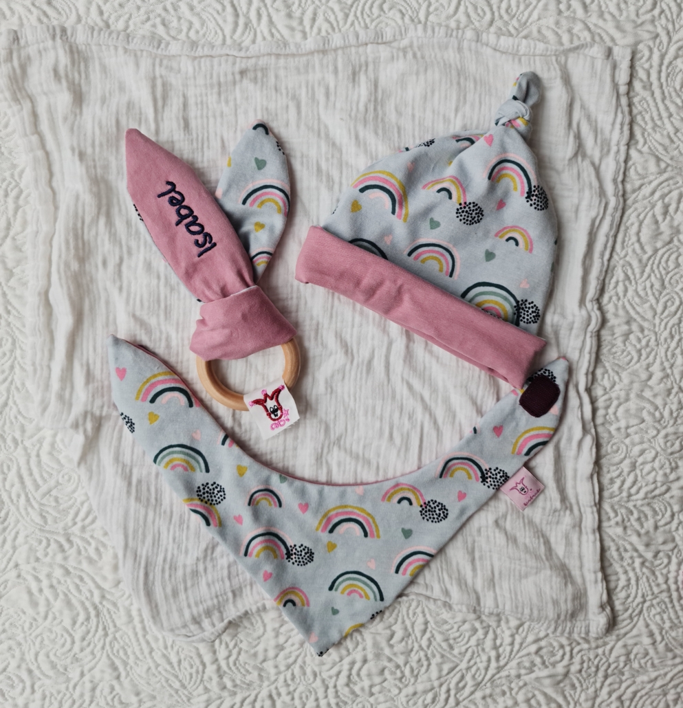 Als Set besonders schön mit Mützchen passendem Halstuch und Knister-Hasenohrbeissring.